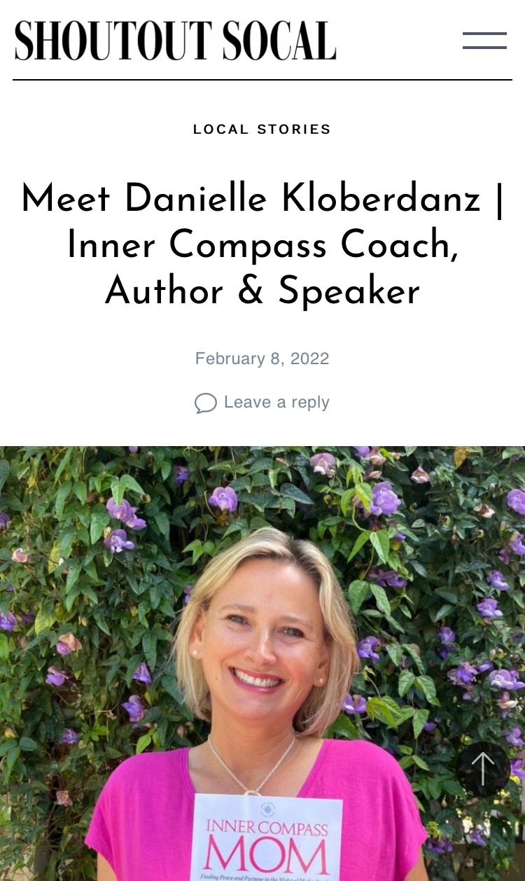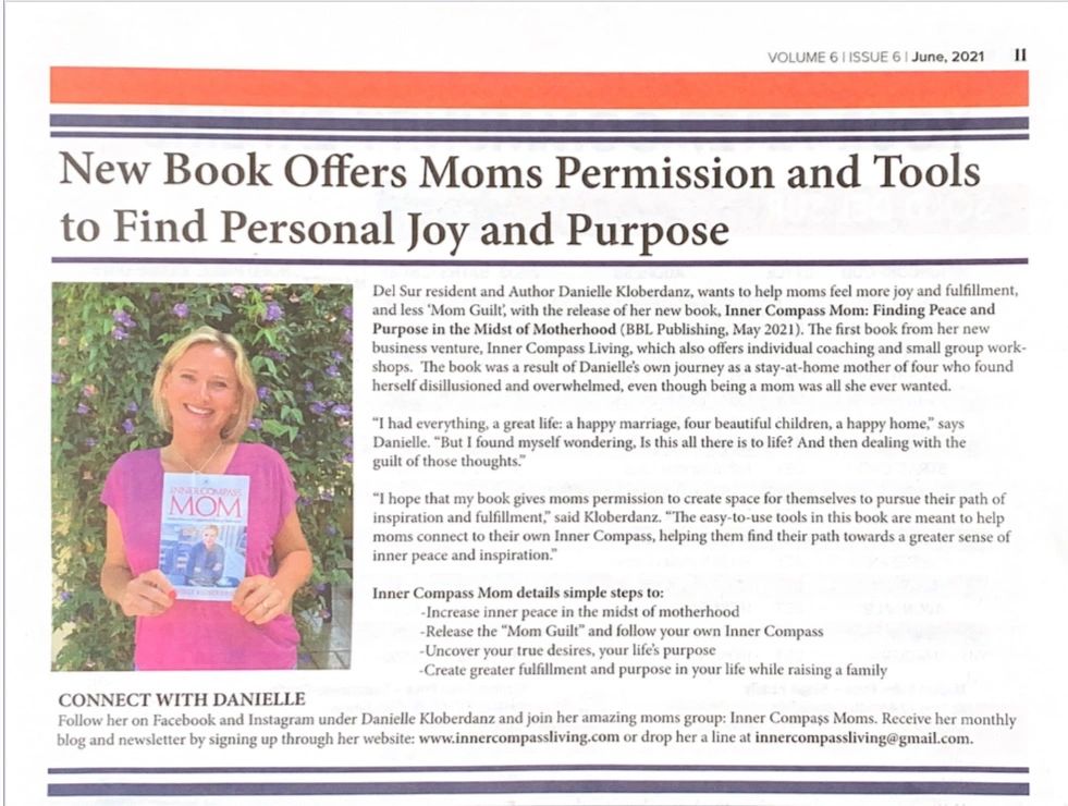 Carlsbad, CA, May 4, 2021 — This Mother’s Day, author Danielle Kloberdanz, wants to help moms feel more joy and fulfillment, and less ‘Mom Guilt’, with the release of her new book, Inner Compass Mom: Finding Peace and Purpose in the Midst of Motherhood (BBL Publishing, May 2021). The first book from her new business venture, Inner Compass Living, releases May 7, 4:30 p.m. PDT with a virtual book launch and Mother’s Day Happy Hour featuring a live Q&A with Kloberdanz, as well as raffle prizes, including free one-on-one consulting sessions.
